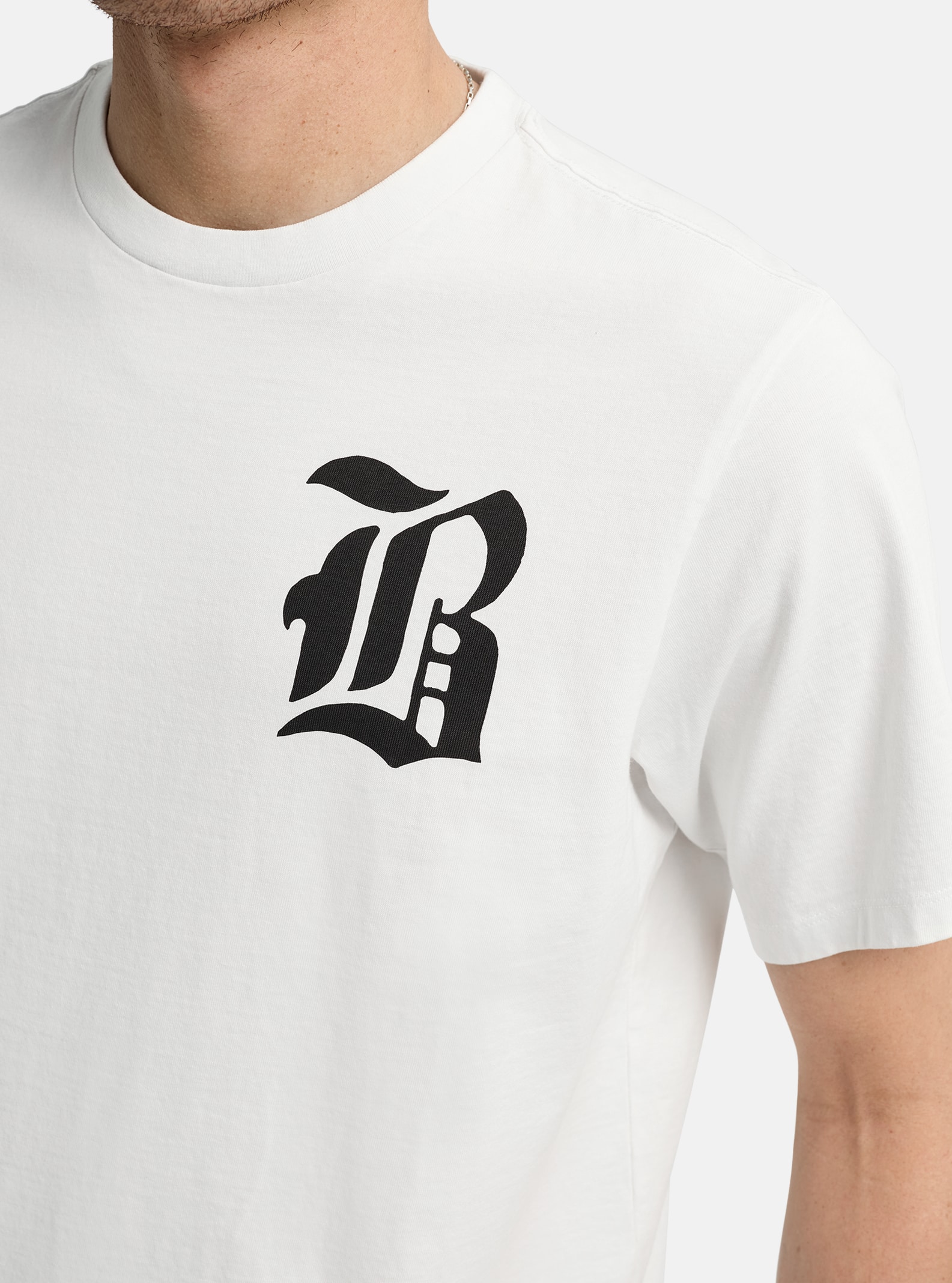 It’s got room to move in the width and a length that lands comfortably but not too long. The collar will hug right near the neck. Sleeves fit loose but not too baggy.