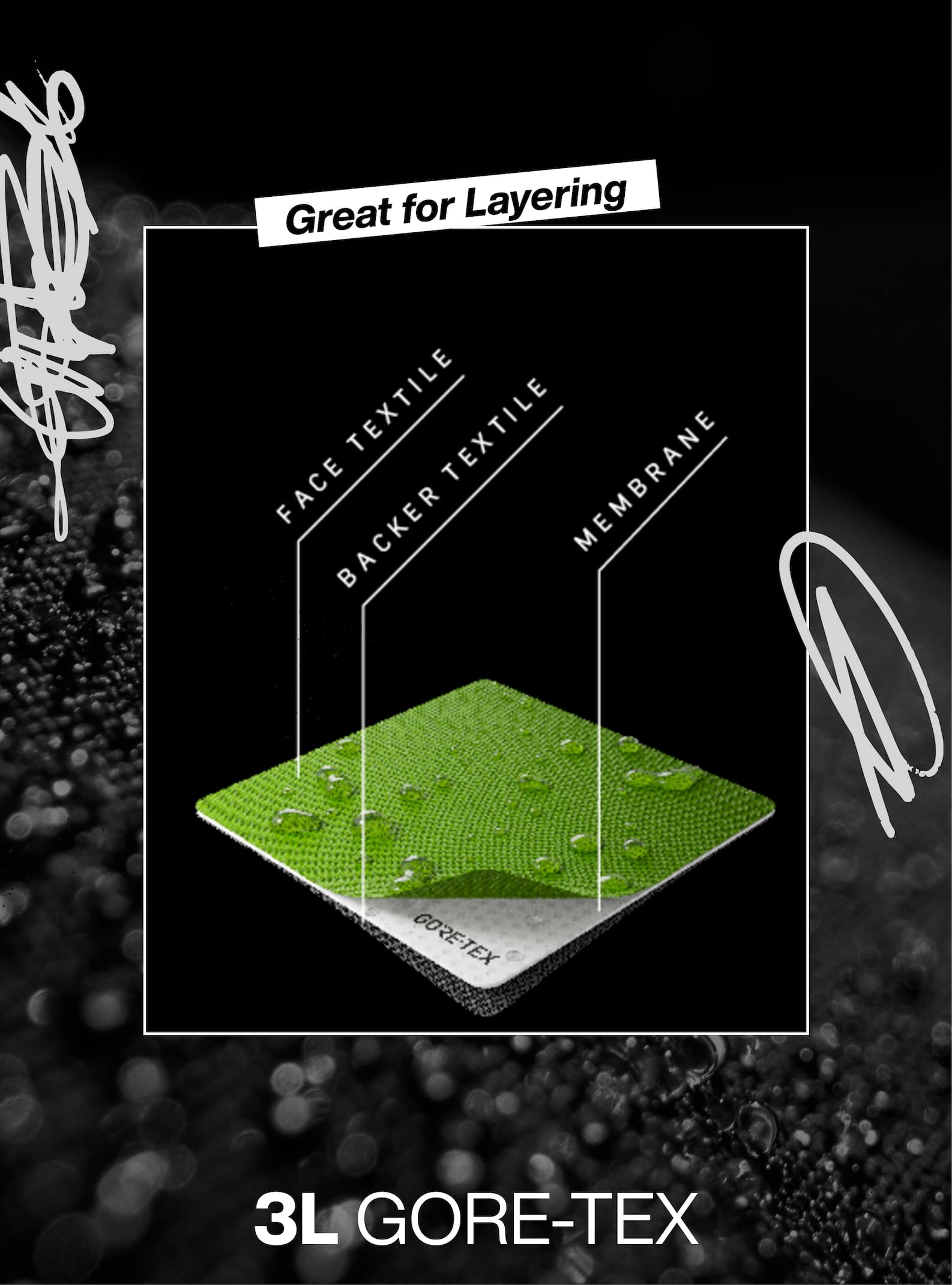 GUARANTEED TO KEEP YOU DRY™ GORE-TEX 3L is lighter weight than 2L GORE-TEX material as well as being waterproof, windproof, breathable, and durable enough to keep you on the move in all weather, period.
